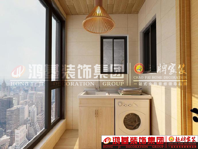 圖七:是陽臺區(qū)域,做了一個洗衣池,洗衣池下面是一個收納區(qū)域,方便收納一些洗衣用品,右邊是滾筒式洗衣機,上面的臺面可以放一些未洗衣物。